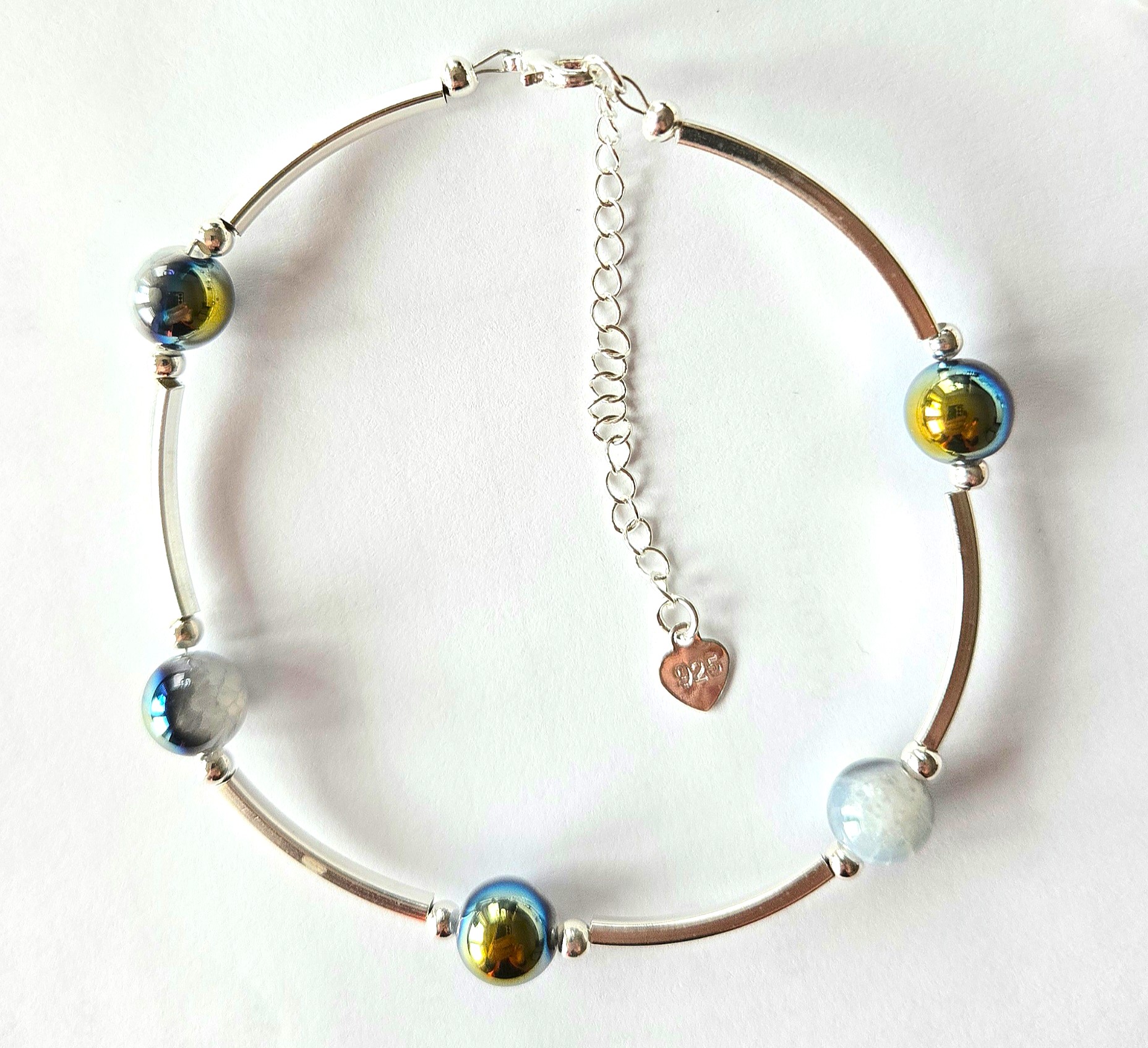 Ta bransoletka to esencja najpiękniejszych zimowych chwil, zamknięta w szlachetny srebrze i mieniącym się hamatycie. Srebrne łuki przypominają oszronione gałązki i czystość ślubnej przysięgi składanej w mroźny dzień, podczas gdy kule hematytu lśnią feerią barw - od ciepłego złota świątecznych światełek, po granat nieba rozświetlonego sylwestrowymi fajerwerkami.