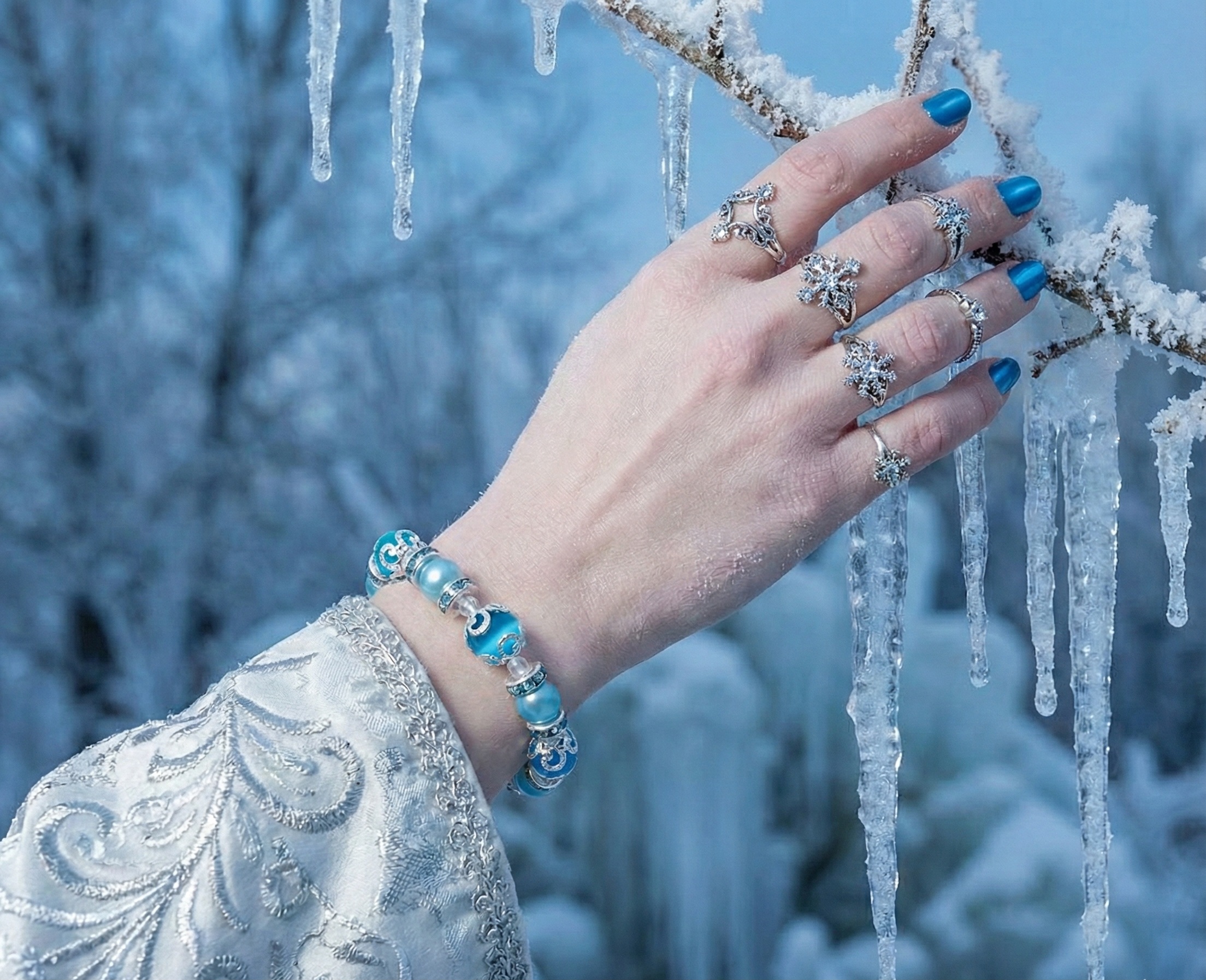 Bransoletka ,,Królowa Śniegu" to esencja zimowego piękna. Wykonana z naturalnego chalcedonu o barwie czystego, zimowego nieba, została wzbogacona o lśniące przekładki ze srebra, wysadzane iskrzącymi cyrkoniami. Całość dopełniają subtelne koraliki akrylowe, które niczym drobiny lodu dodają biżuterii lekkości i przejrzystości.