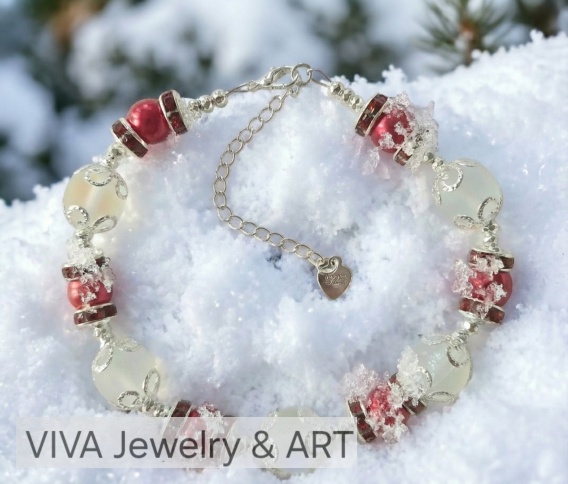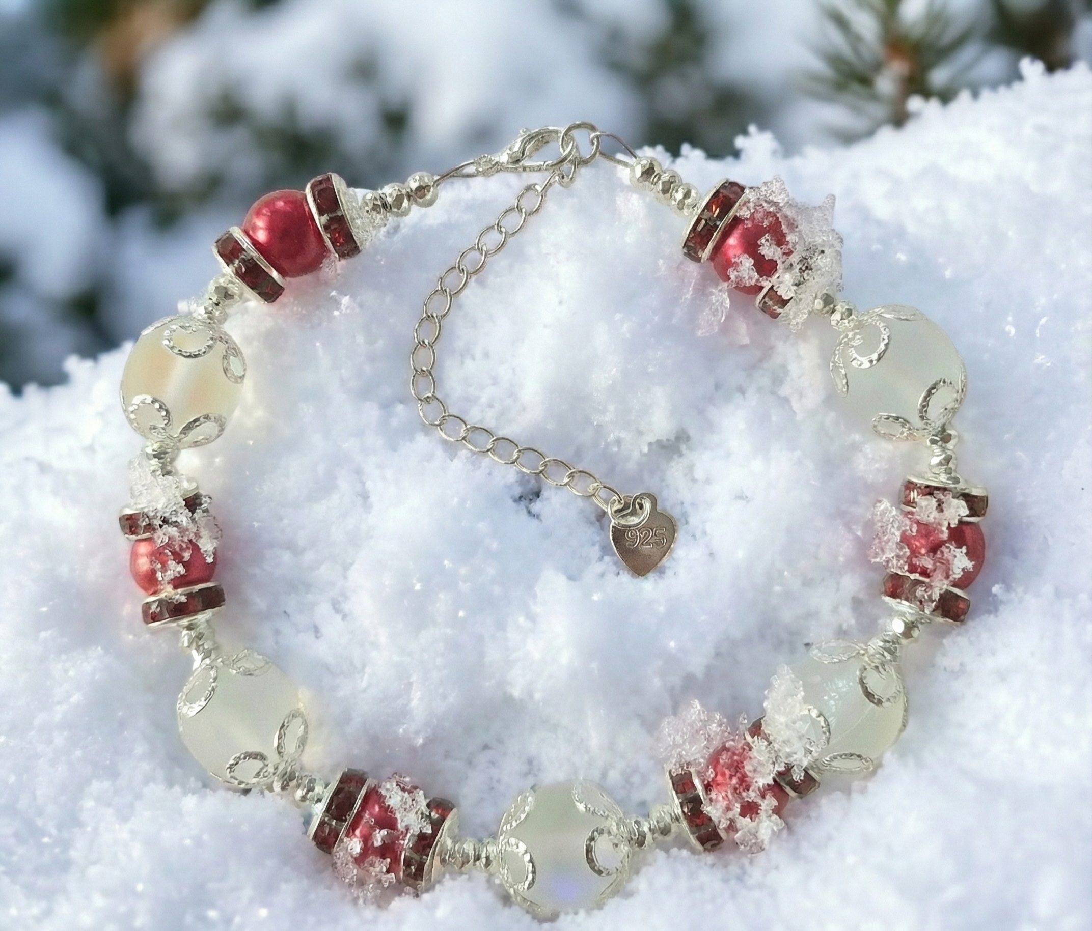 ,,Magia Świąt" to niezwykła bransoletka - harmonije połączenie mistycznego kamienia księżycowego z energetyczną, głęboką czerwienią, oprawione w szlachetne srebro próby 925. Mleczny blask kamieni przywodzi na myśl zimowy śnieg, poczas gdy czerwone elementy i lśniące cyrkonie dodają jej świątecznego charakteru i wieczorowej elegancji.
