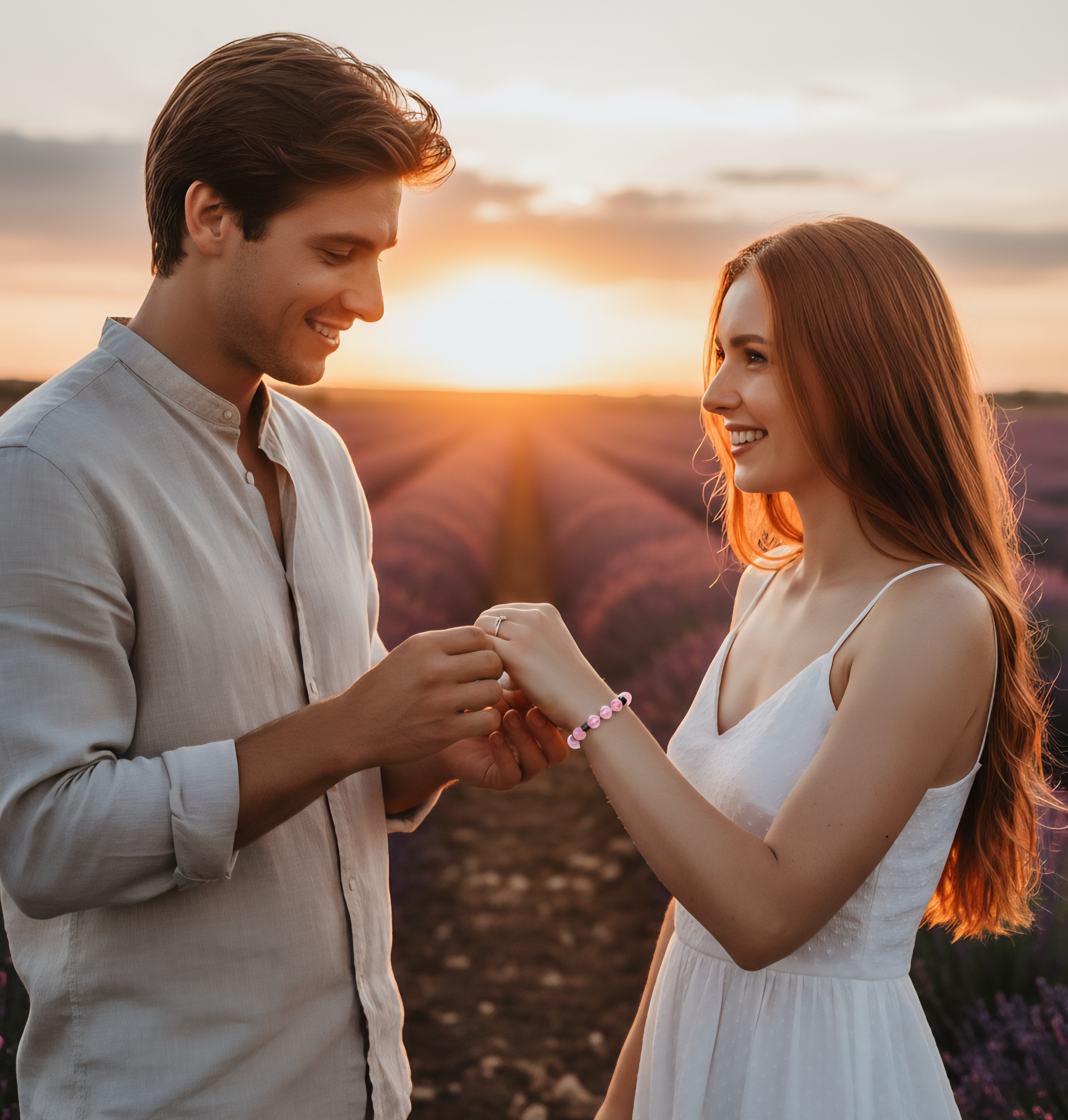 Bransoletka ,,Mon rayon de soleil" to coś więcej niż tylko ozdoba - to obietnica, wspomnienie i czuły dotyk utrwalony w kamieniu. Wyobraź sobie, że idziecie razem przez rozległe pola Prowansji, słońce chyli się ku zachodowi, a powietrze pachnie lawendą. Właśnie wtedy, w otoczeniu fioletowego morza, on wręcza Ci tę bransoletkę.