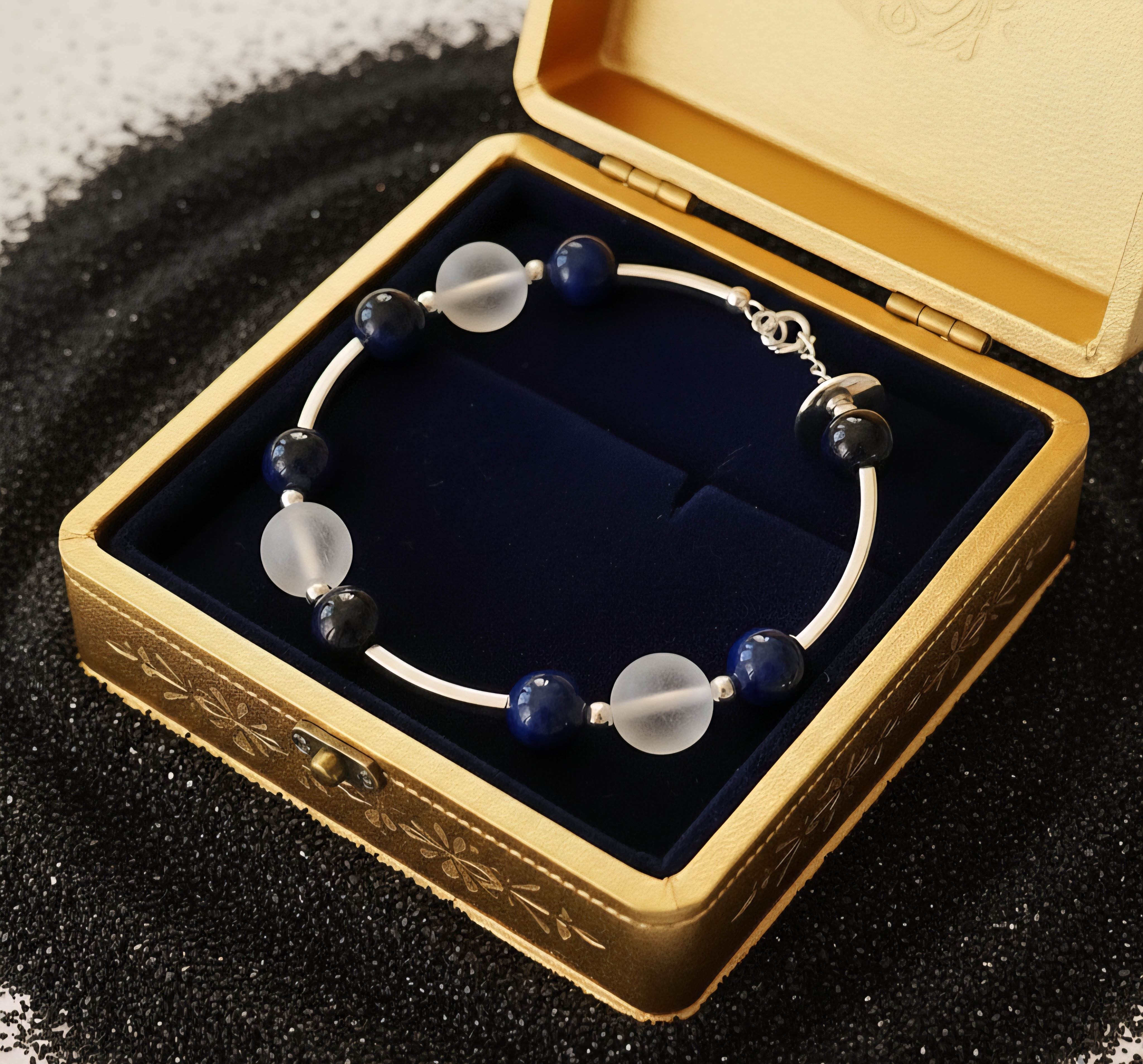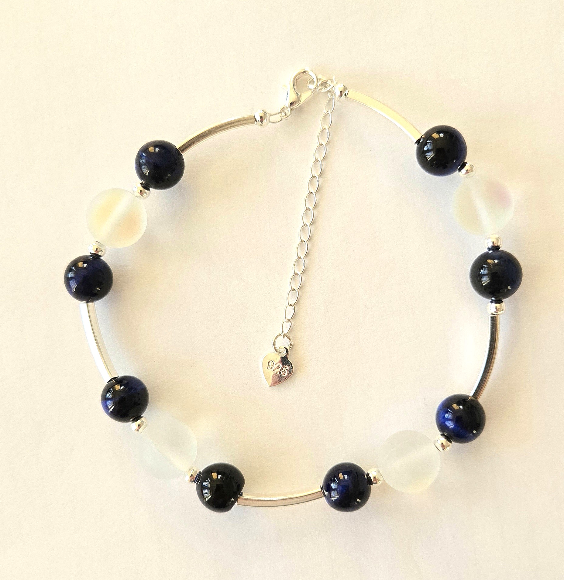 Bransoletka składa się z naturalnych kamieni: intensywnego lapis lazuli i delikatnego kamienia księżycowego. Lapis lazuli, znany z głębokiego, granatowego koloru symbolizuje mądrość, prawdę i wewnętrzny spokój. Kamień księżycowy, o mlecznej poświacie i opalizującym efekcie, nawiązuje do intuicji, kobiecej energii i równowagi emocjonalnej. Te kamienie doskonale się uzupełniają, tworząc harmonijną całość.
