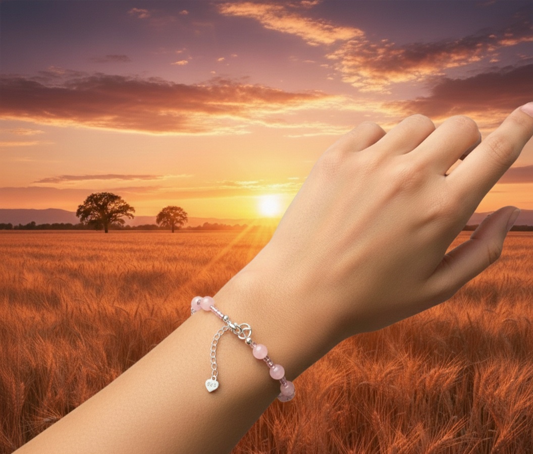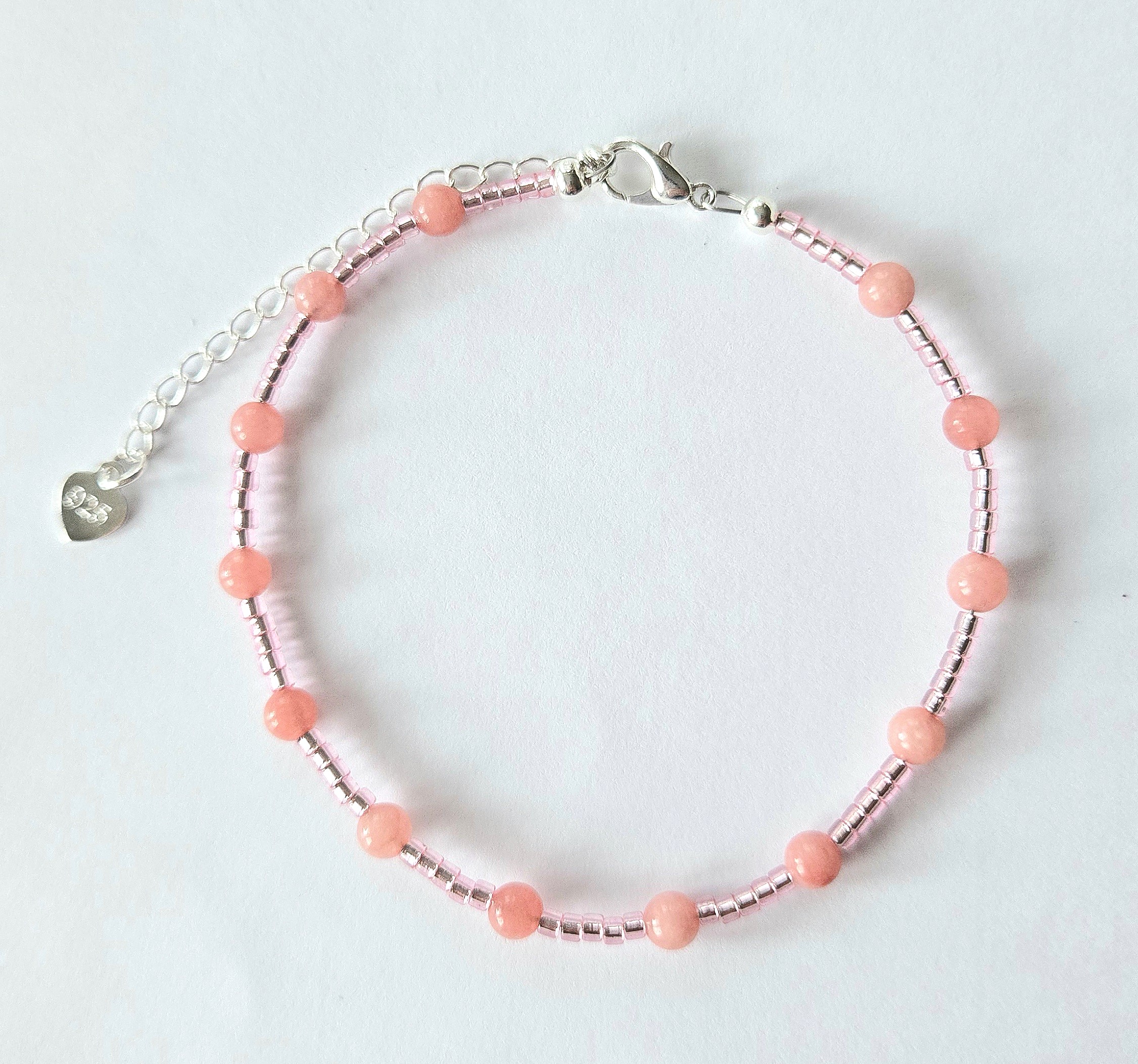 Ta urocza, regulowana bransoletka to esencja letniej lekkości i kobiecości, idealna na upalne, letnie dni. Stworzona z gładkich kuleczek różowego chalcedonu i przeplatanych, szklanych, różowych przekładek, emanuje subtelnym blaskiem i świeżością.