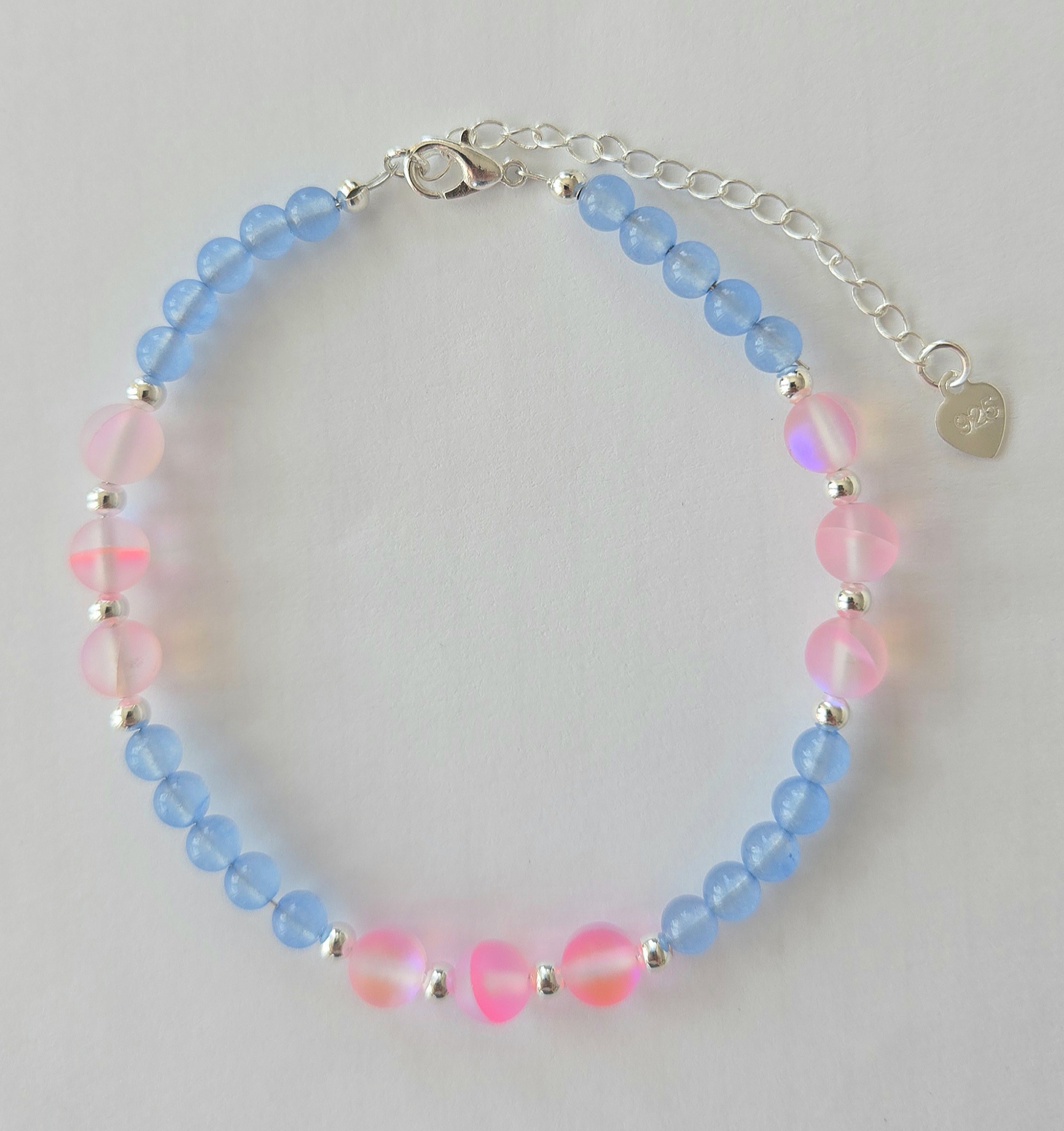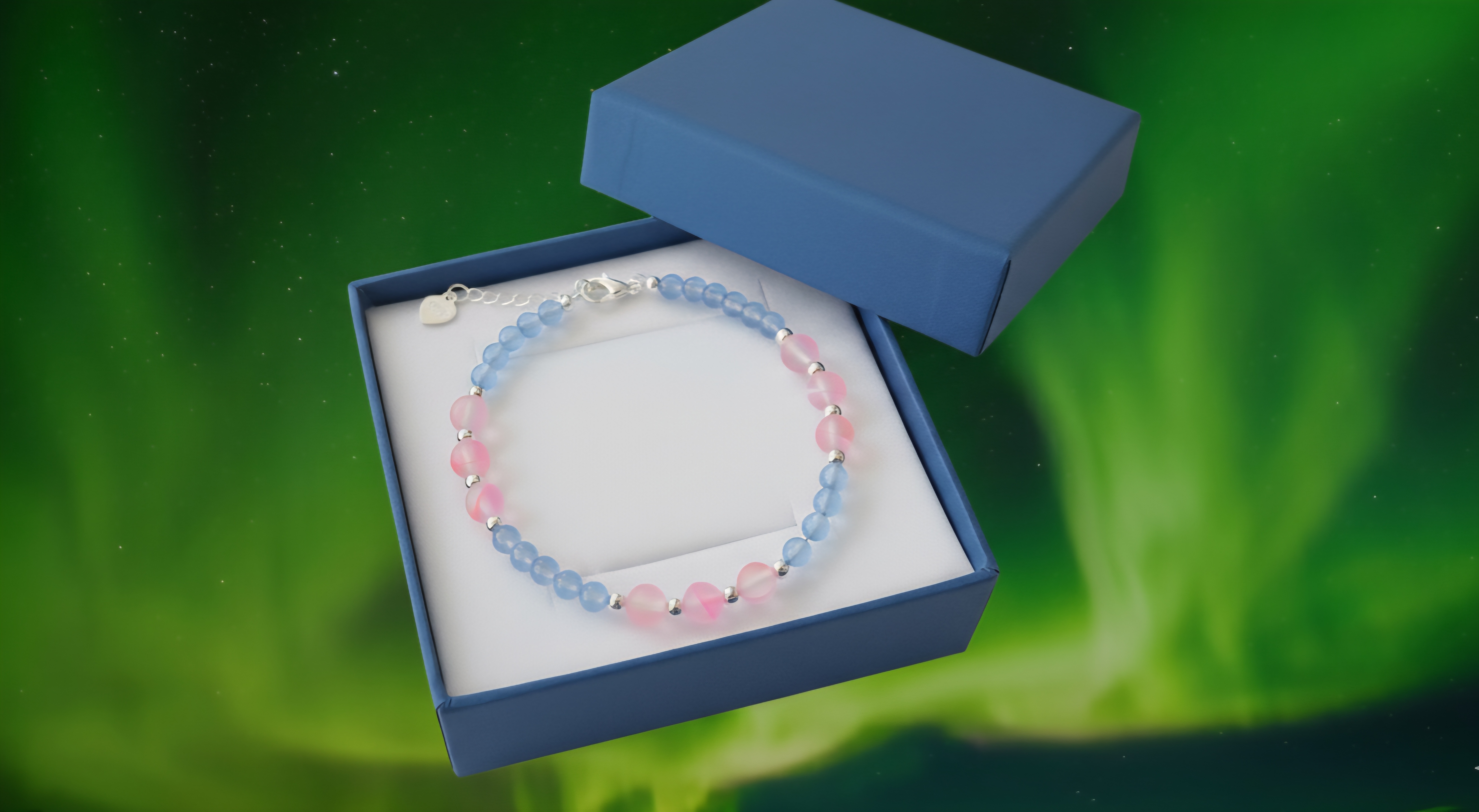 Głównym elementem bransoletki jest różowy spektrolit, którego kamienie mienią się w świetle niczym prawdziwa zorza polarna, ukazując subtelne przejscia barw od delikatnych róży po głębokie fiolety. Każdy kamień to unikalny, naturalny spektakl. Towarzyszy mu błękitny kamień kociego oka, który z tajemniczym blaskiem przypomina migotliwe, zimowe gwiazdy na ciemnym niebie.