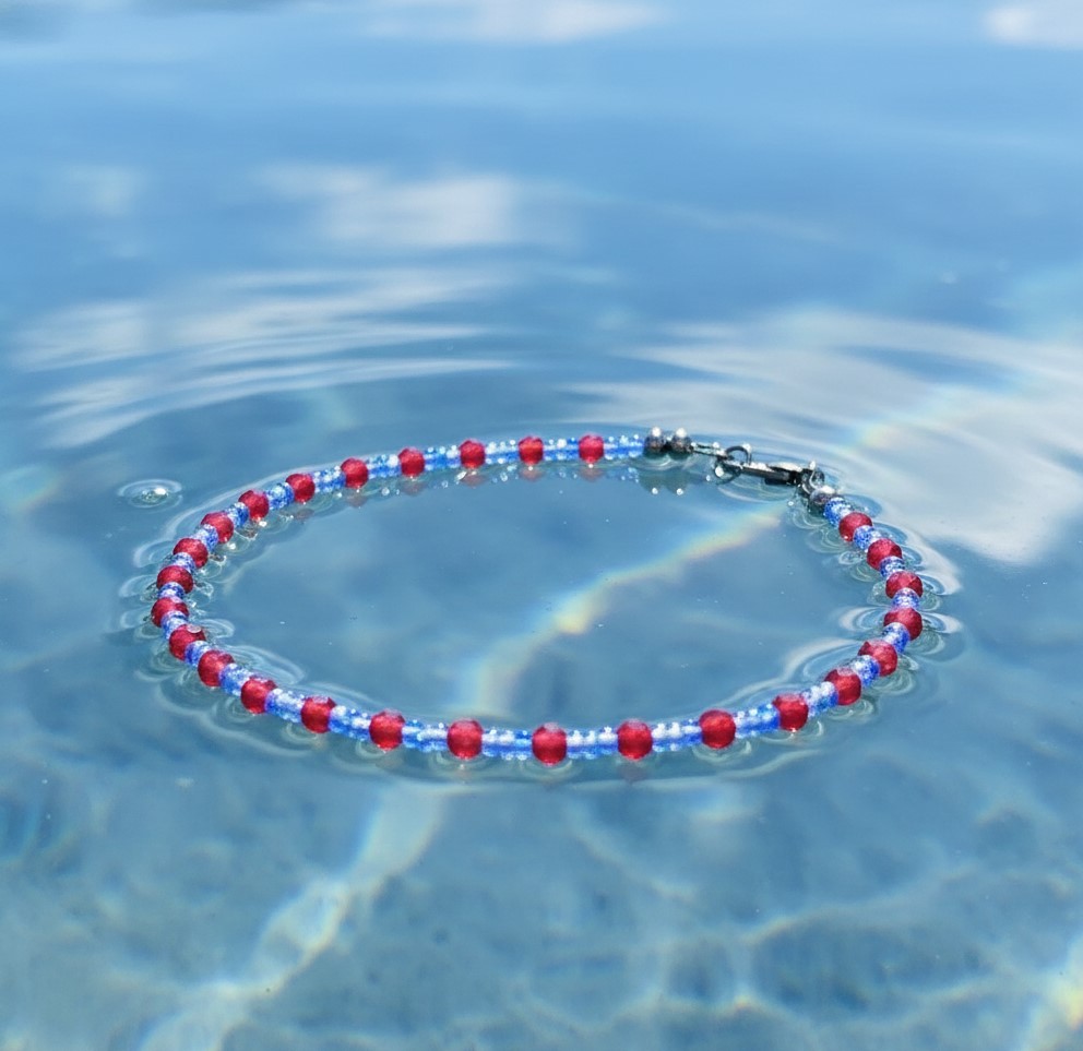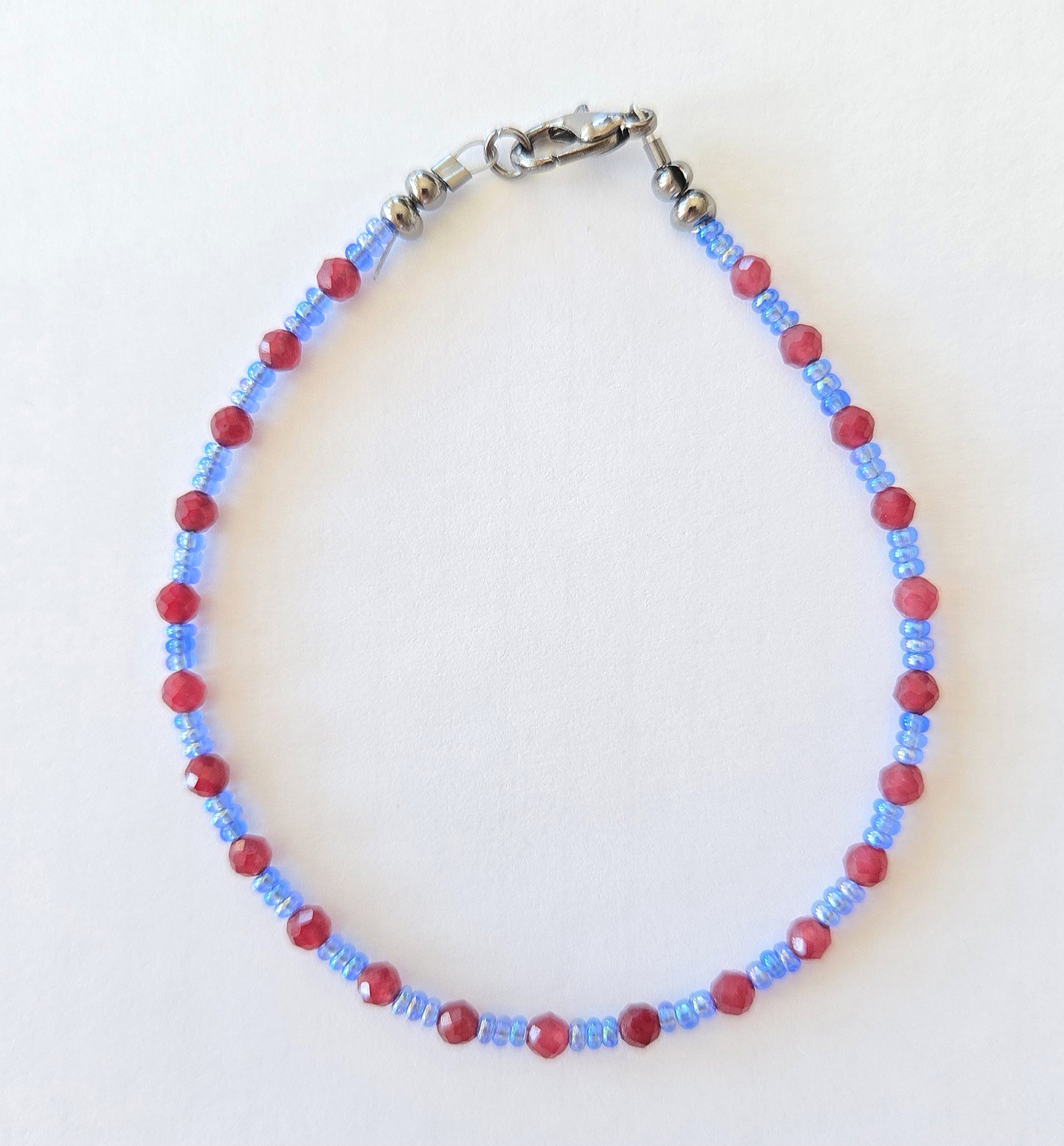 Bransoletka z chalcedonu czerwonego ze szklanymi niebieskimi akcentami to niezwykłe połączenie kolorów, które przyciąga spojrzenia i dodaje charakteru każdej stylizacji. Czerwień symbolizuje pasję i energię, podczas gdy niebieskie akcenty nadają delikatności i elegancji.