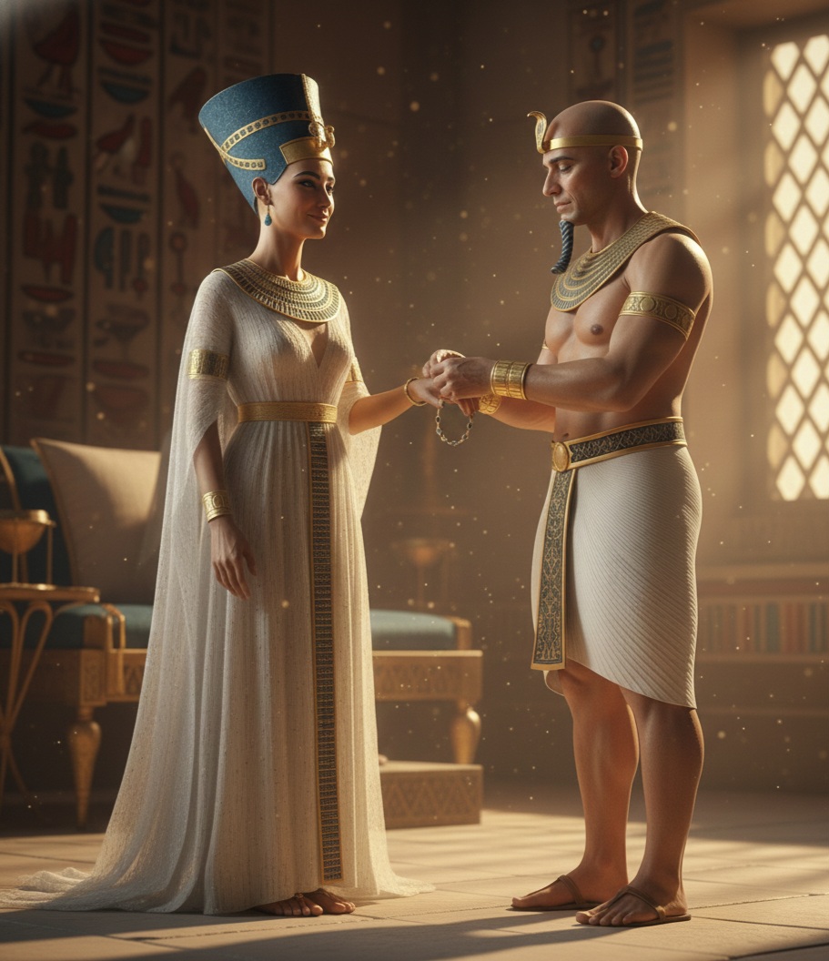 To był dar nie tylko ze szlachetnyck kamieni, ale akt duchowego zjednoczenia. Bransoletka, dotykając jej skóry, stała się niewypowiedzianą obietnicą wiecznej miłości, która miała przetrwać piaski pustyni i granice czasu. To był najgłębszy dar serca Faraona, złożony przed Królową, która była jego światłem i jego natchnieniem.