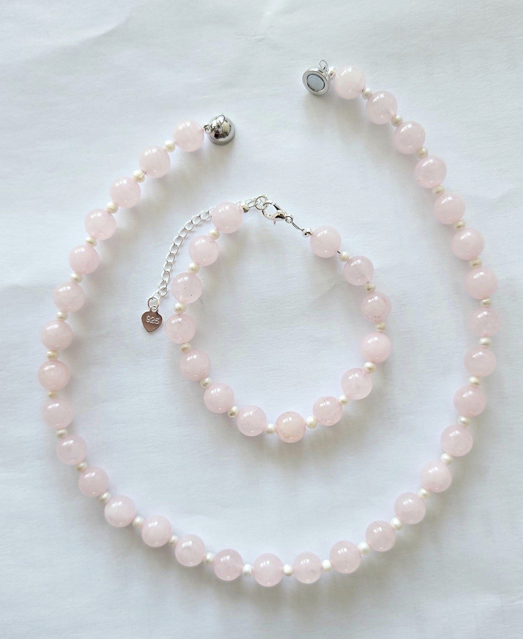 Komplet biżuterii z obsidianu i pereł naturalnych jest nowym projektem stworzonym z myślą o nadchodzącym lecie. Obsidian to minerał, któremu przypisuje się właściwości ochronne, obdarzanie mądrością i siłą, sprzyja koncentracji, oddala znużenie i zmęczenie po wysiłku intelektualnym. Delikatny różowy kolor obsidianu w połączeniu z bielą pereł naturalnych podkreśli skórę muśniętą letnim słońcem, zwróci uwagę na letnią opaleniznę. Róż przypomni o kolorze zachodzącego słońca, odbijającego się w letnich obłokach. Naszyjnik typu choker czyli o niewielkim obwodzie otuli delikatnie szyję kobiety, czyniąc jej kreację wyjątkową. Nadaje się na ciepłe letnie wieczory, jako eleganckie uzupełnienie designe'u jak też jako uzupełnienie casualowego outfitu.