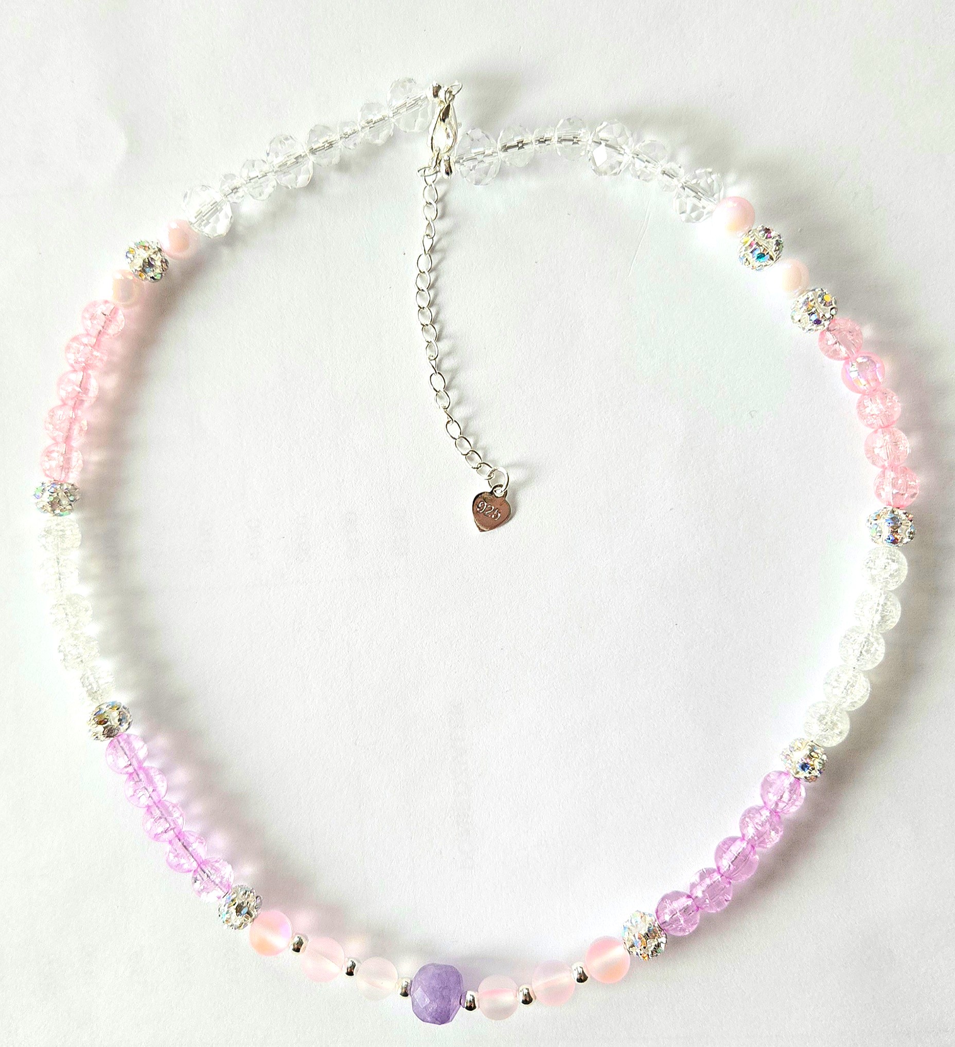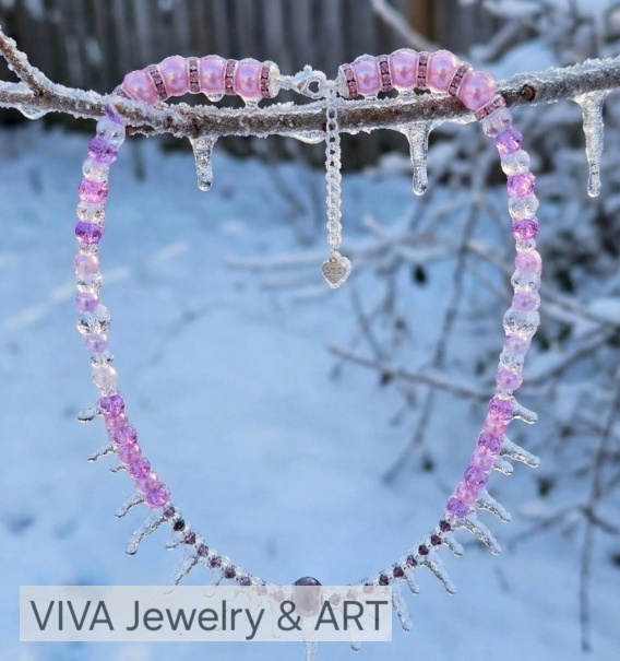Ku górze naszyjnik przechodzi w jaśniejsze tony fioletu i perłowego blasku, co nadaje całości lekkości i sprawia, że biżuteria pięknie rozświetla twarz.