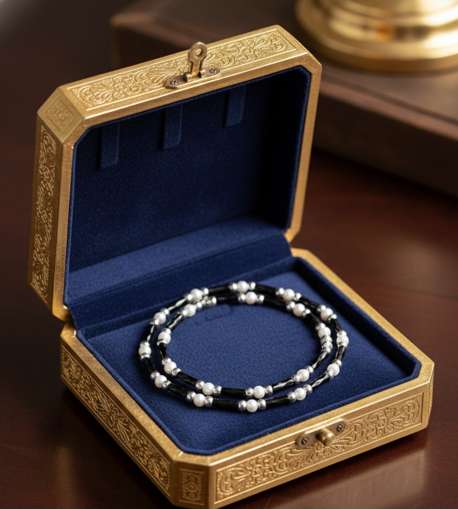 Delikatne, świetliste perełki o naturalnym uroku snują się w harmonii z lśniącymi, srebrnymi kuleczkami, które niczym miniaturowe księżyce odbijają każdy promień światła. Między nimi, z gracją i tajemniczością, pojawiają się czarne, szklane przekładki. To one dodają kompozycji intrygującej głębi, przypominając o gwiaździstej nocy, kiedy światła odbijają się w tafli wody.