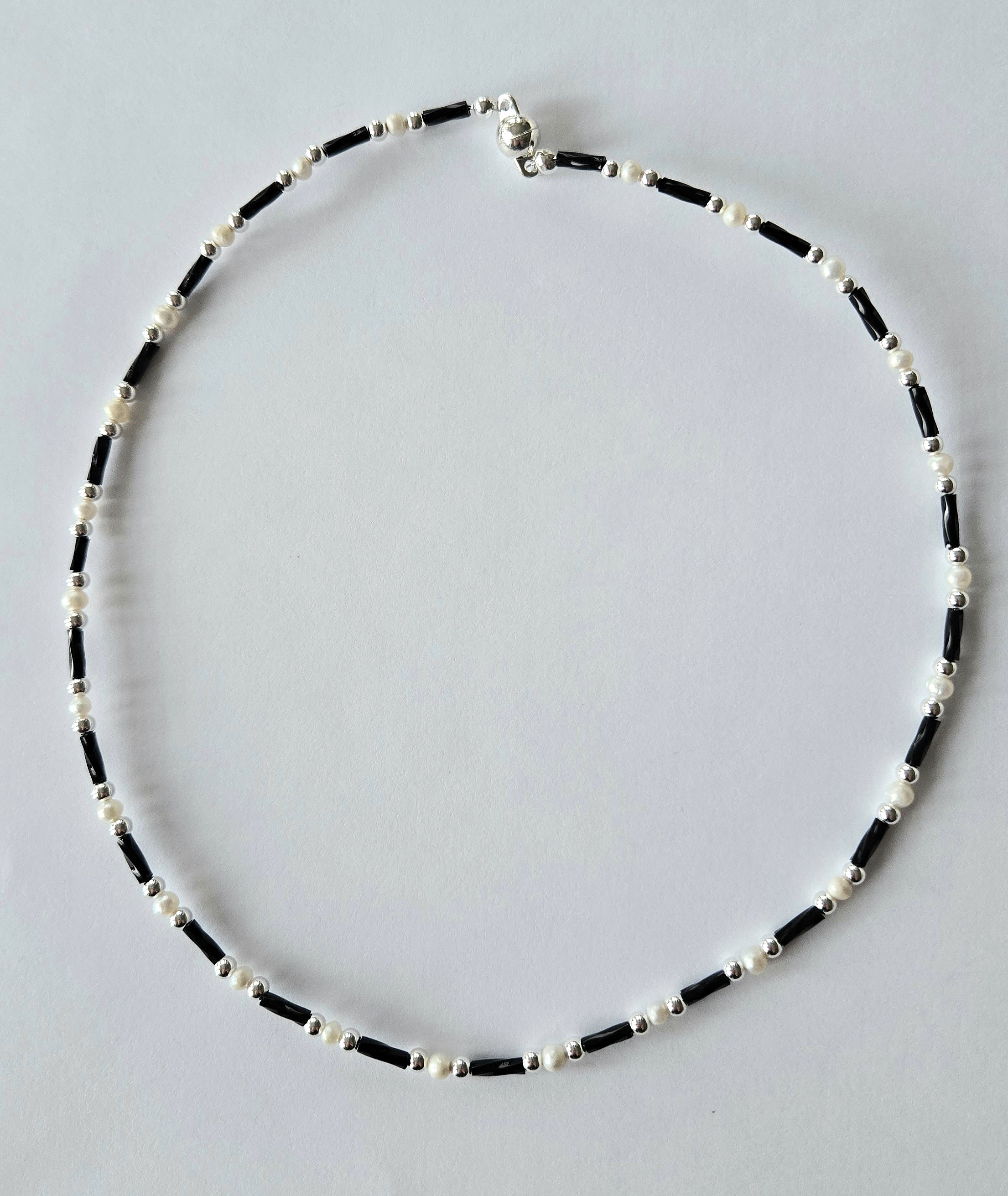 Naszyjnik wykonany jest z naturalnych perełek o średnicy zaledwie 3mm, otulonych srebrnymi dwumilimetrowymi kuleczkami, a kolor perełek i srebra kontrastuje ze szklanymi czarnymi przekładkami. Zapięcie magnetyczne, wygodne i praktyczne, ułatwia zakładanie i zdejmowanie tej biżuterii. Niewielki obwód, 38 cm pięknie prezentuje się na kobiecej szyi.
