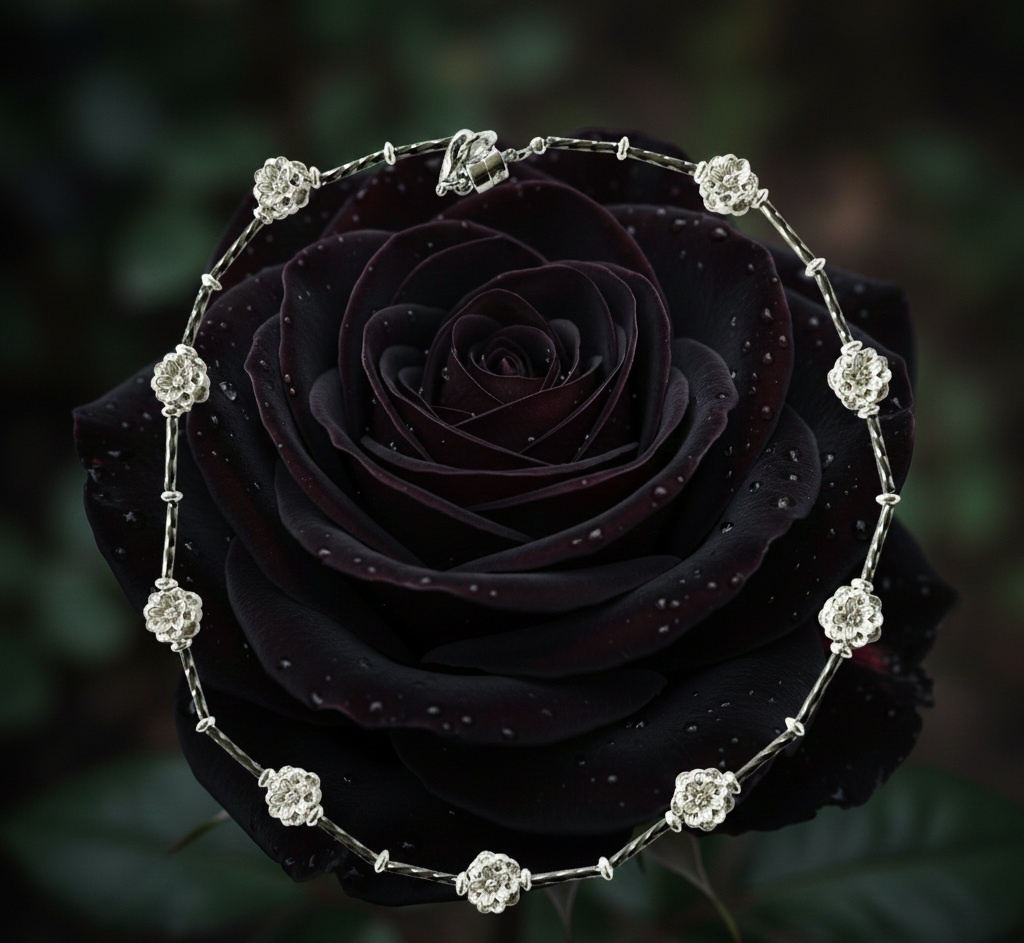 Pomiędzy tymi metalicznymi kwiatami, jak krople artamentu w gęstej mgiełce, pojawiają się czarne szklane przekładki. To one dodają głębi i intrygi, niczym mrok, który otula najbardziej romantyczne chwile. Ich gładka powierzchnia odbija światło w tajemniczy sposób, zapraszając do snu o nieskończoności.
