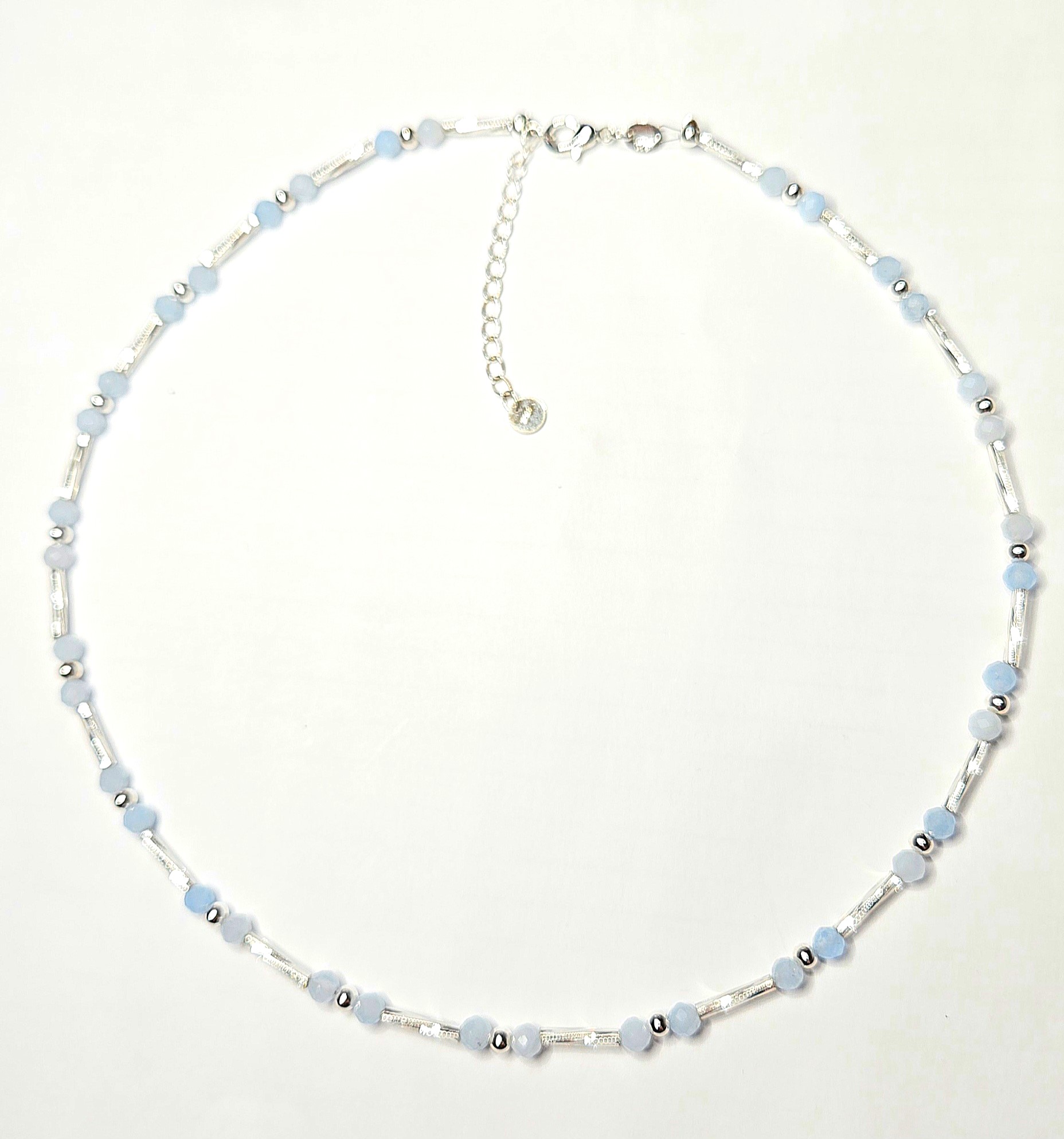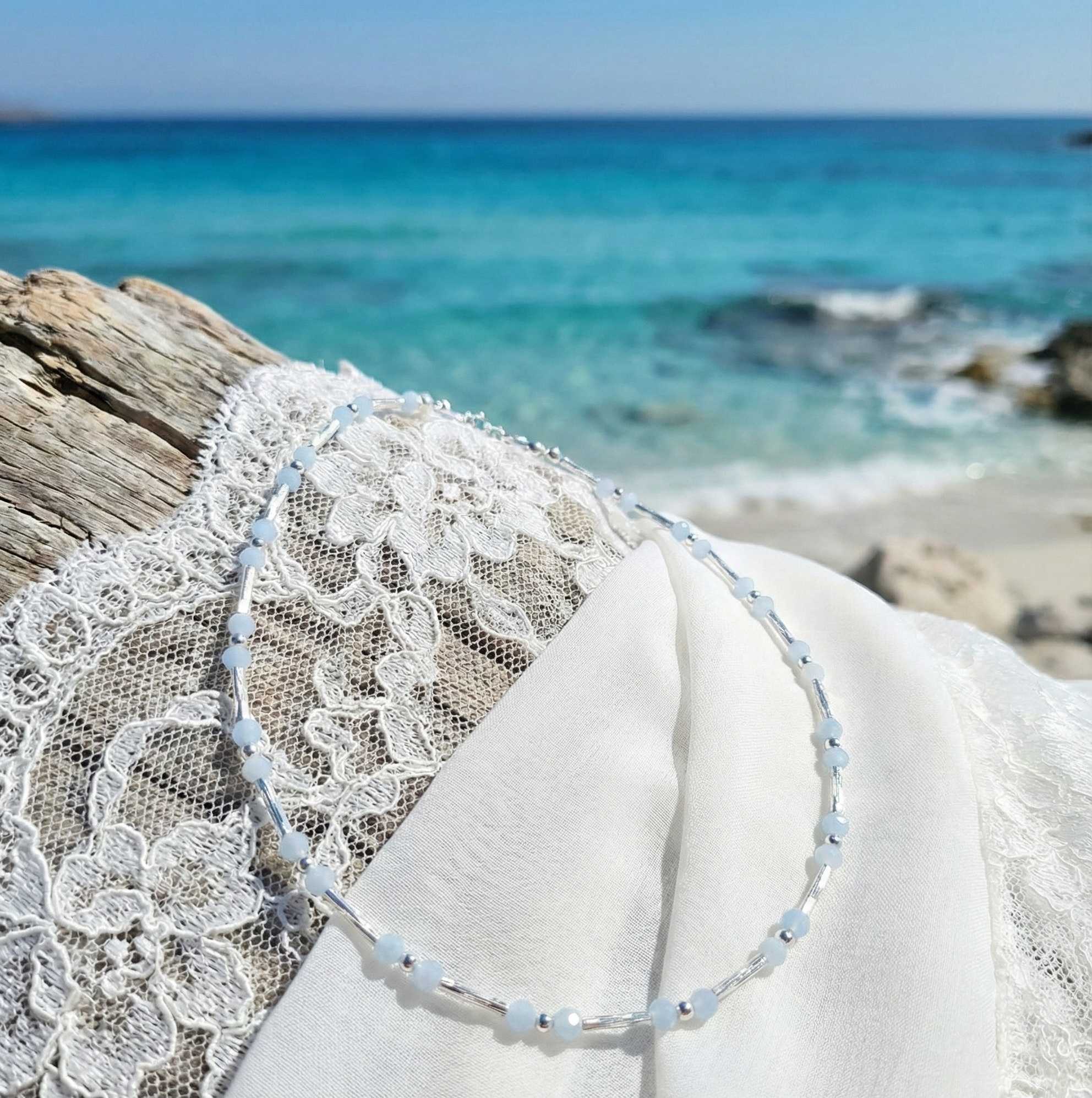 Naszyjnik bazuje na rytmicznym układzie kamieni i elementów ozdobnych. Wykorzystano w nim akwamaryn, kamień szlachetny o delikatnym, błękitnym odcieniu. Srebrne kuleczki dodają tej biżuterii eleganckiego sznytu, a szklane, podłużne elementy nadają konstrukcji lekkości nowoczesnego charakteru.