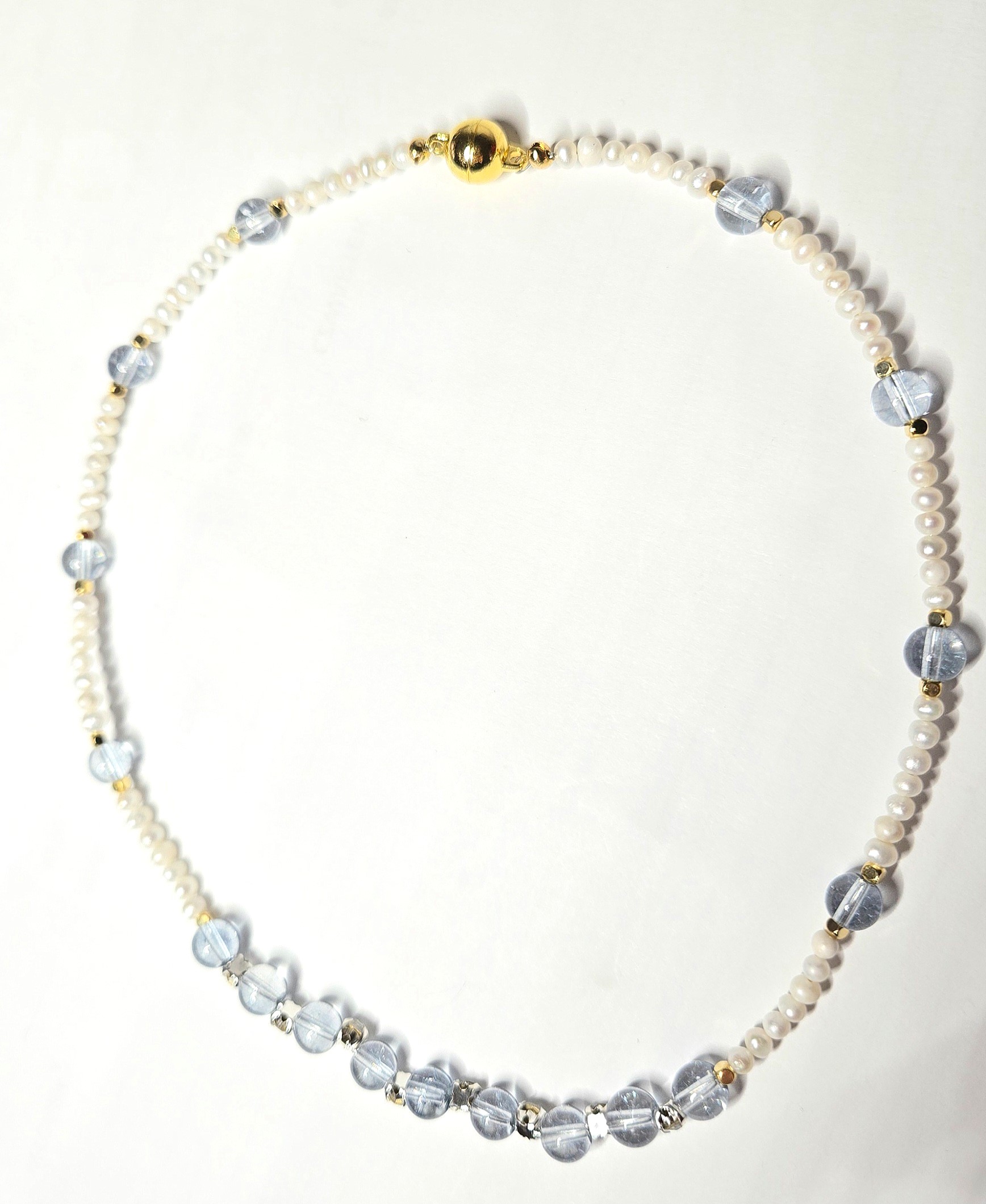NASZYJNIK ,,PERŁOWA OBIETNICA" Z TOPAZU, PEREŁ I SREBRA POZŁACANEGO 18 - KARATOWYM ZŁOTEM