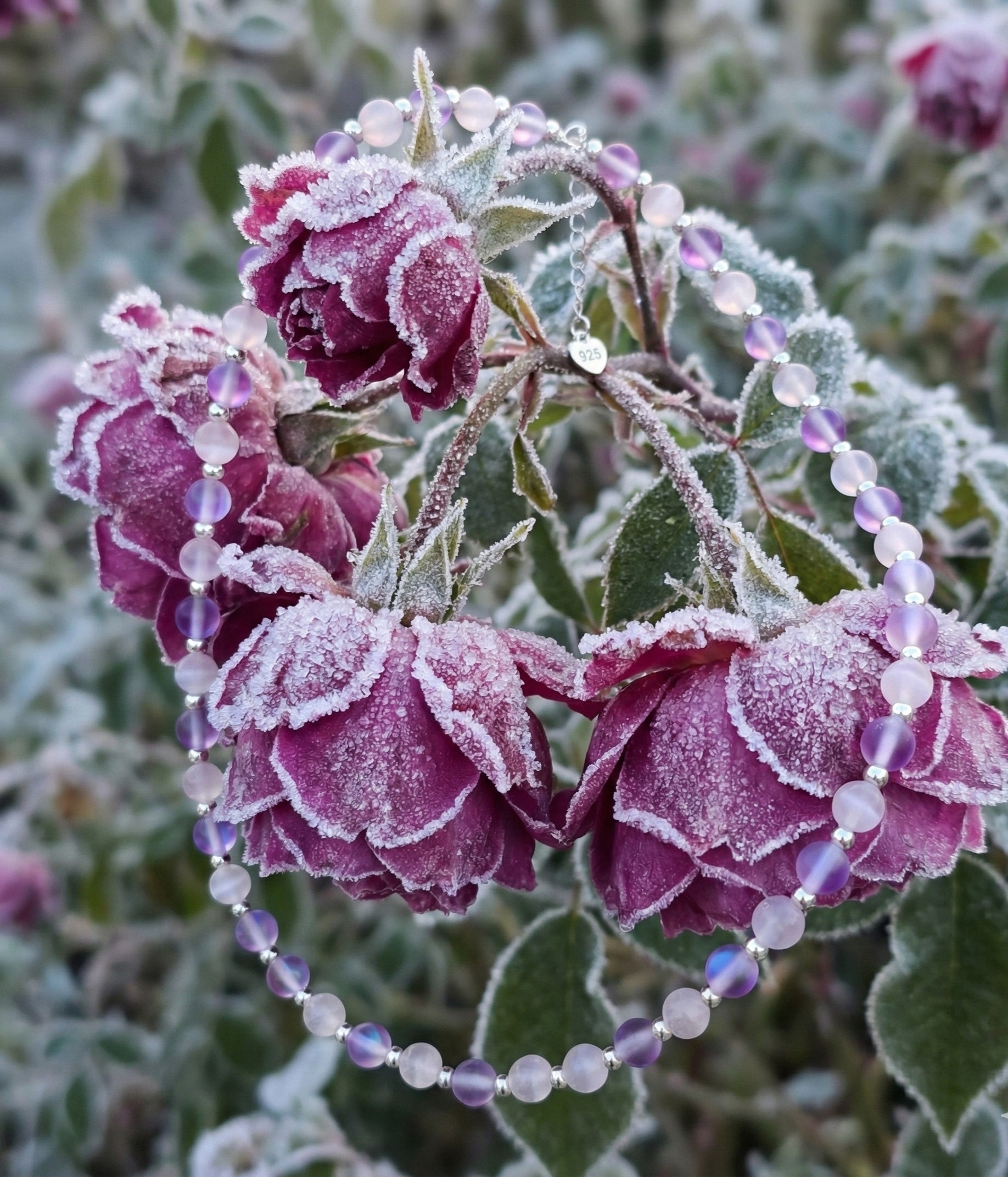 Wyobraź sobie mroźne popołudnie, gdy słońce chowa się za horyzont, malując niebo odcieniami fioletu i różu, a świat powoli otula chłodny cień nocy. Albo pąk dzikiej róży, który przetrwał do pierwszych śniegów, uwięziony w krystalicznej warstwie szronu. Tę niezwykłą grę ciepła i zimna zamknęliśmy w naszyjniku ,,Różany Horyzont."