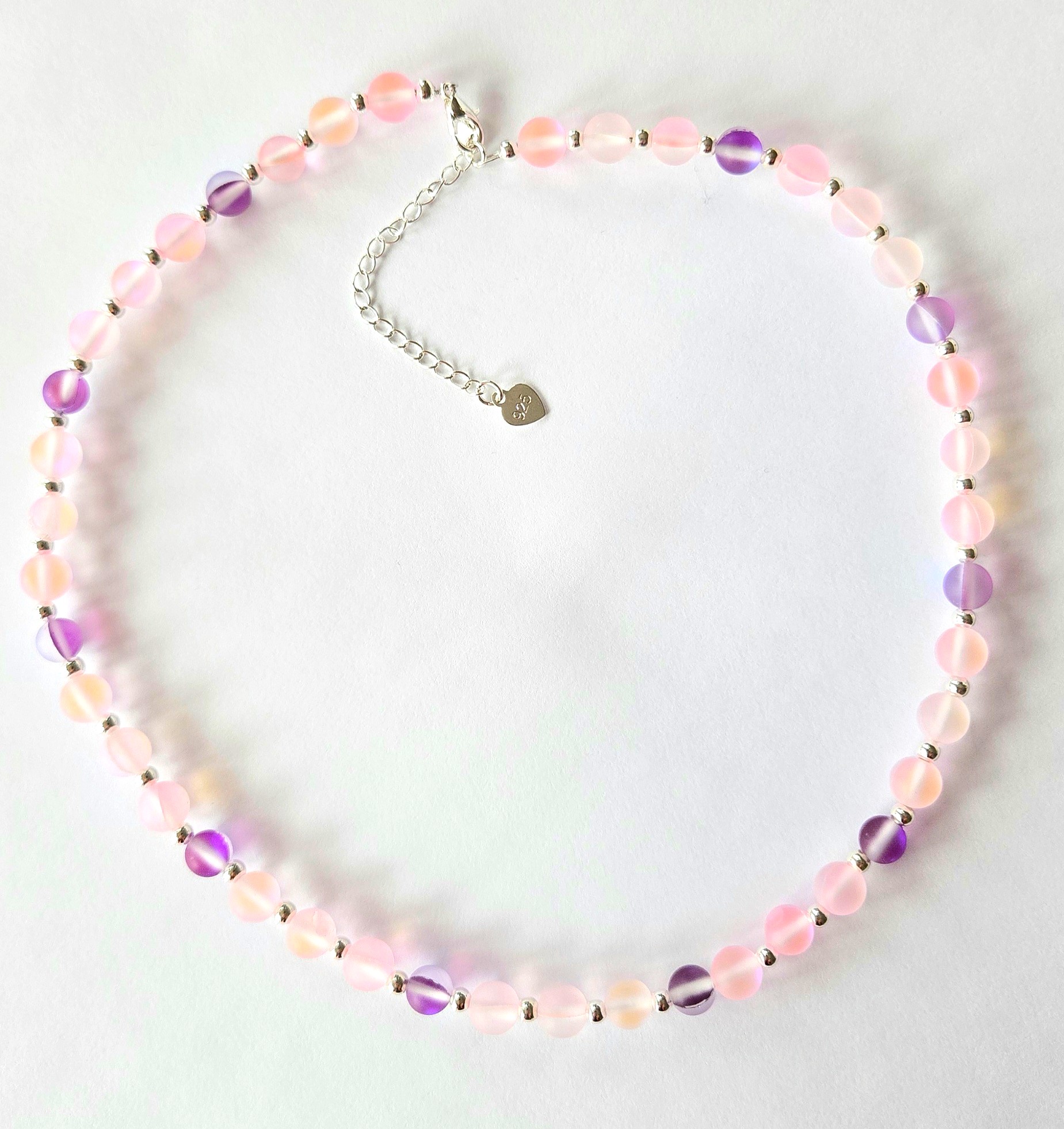 • NASZYJNIK ,,RÓŻANY HORYZONT" ZE SPEKTROLITU I KAMIENIA AUSTRIACKIEGO ZE SREBREM