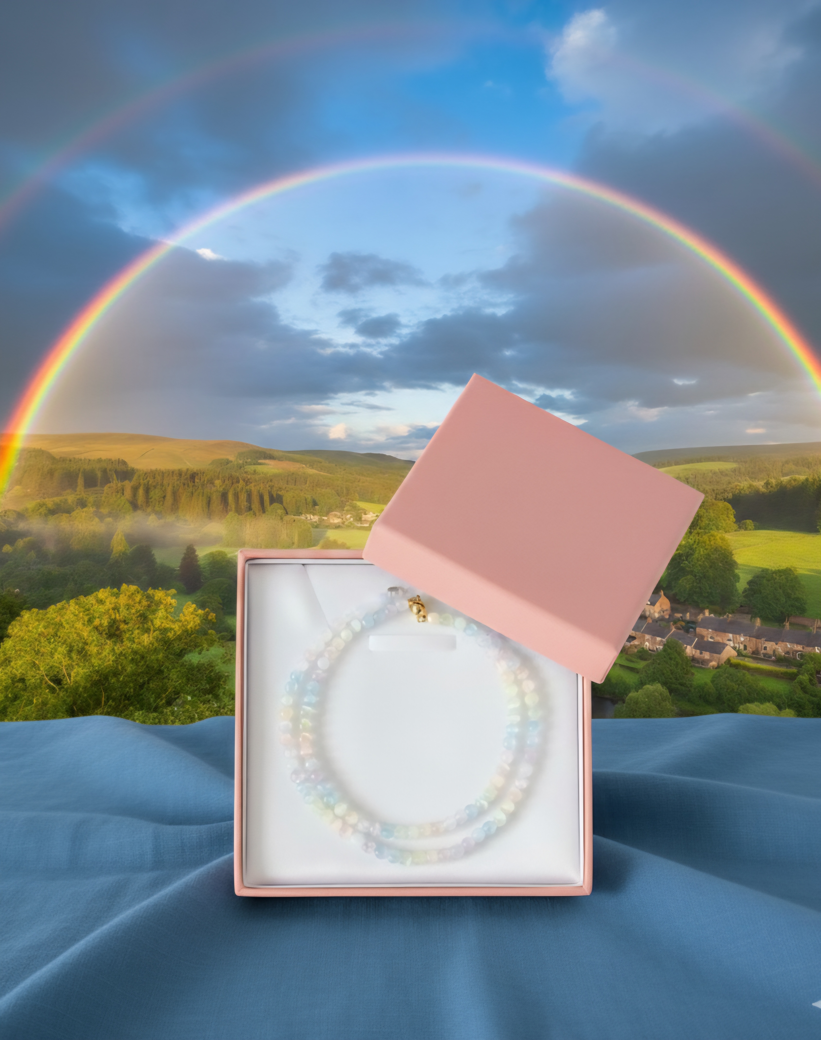 ,,Tęczowa Kolia” to nie tylko spektakularny dodatek, ale też wyraz Twojej miłości do natury i jej cudów. Każdy koralik to miniatura tęczy, a całość tworzy harmonijną kompozycję, która przyciąga wzrok i inspiruje. Jest to idealny naszyjnik dla osób, które cenią sobie oryginalność, symbolikę i pozytywną energię. Noś go, aby przypominać sobie o pięknie, które kryje się w świecie, o nadziei, która zawsze następuje po trudnościach, i o radości, którą niesie ze sobą każdy nowy dzień.