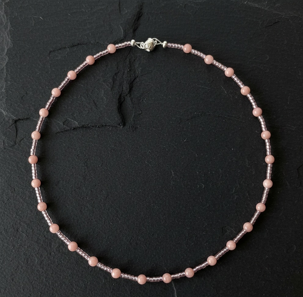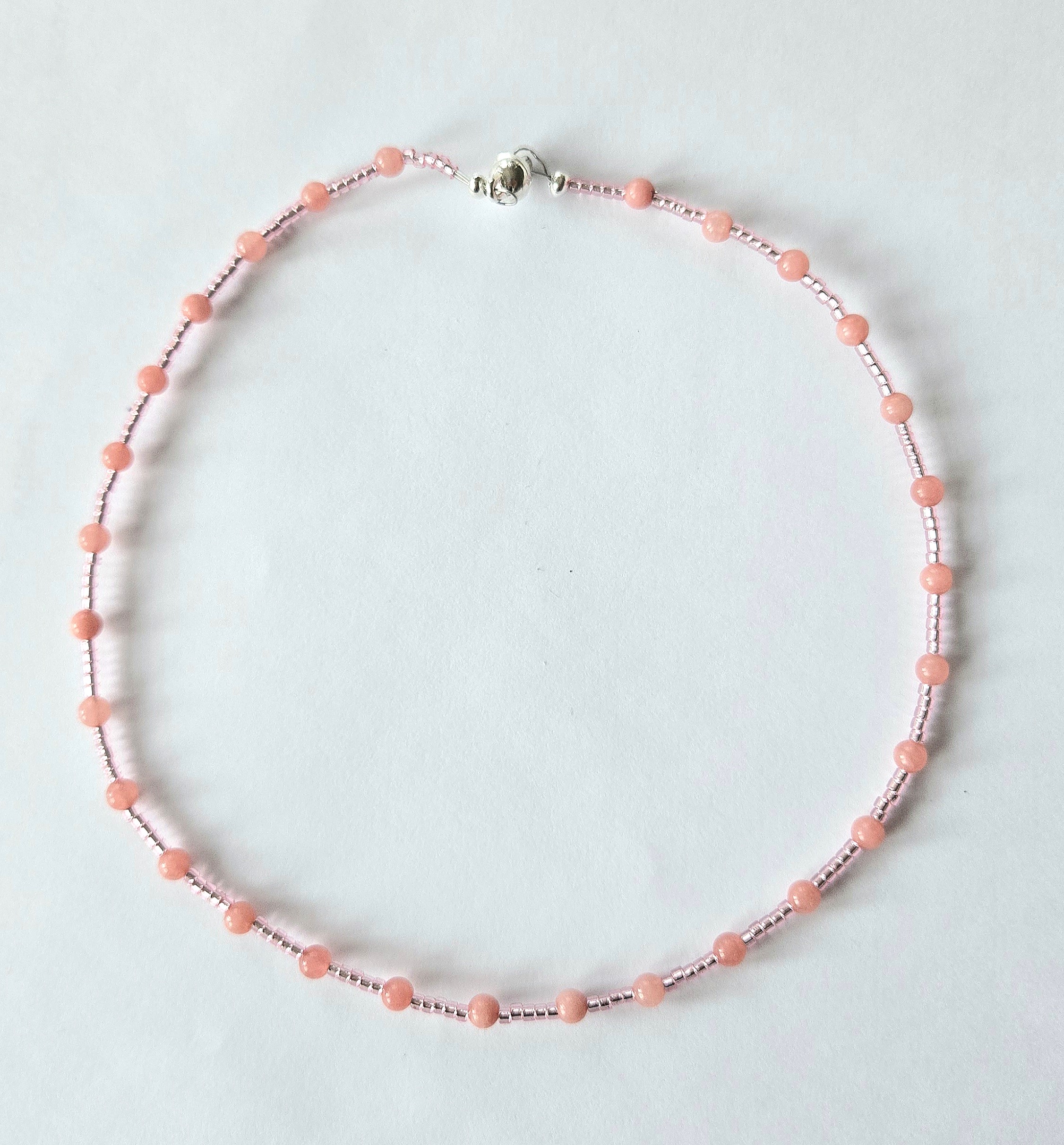 Delikatne koraliki i przekładki sprawiają, że naszyjnik jest niezwykle przyjemny w noszeniu, nie obciąża i pięknie układa się na skórze. Jasny, mleczny róż chalcedonu doskonale współgra z transparentnymi, szklanymi elementami, dodającymi naszyjnikowi lekkości i blasku idealnego na słoneczne dni. Jego prostota i elegancja sprawiają, że pasuje zarówno do casualowych stylizacji, jak i do bardziej wyjściowych, wieczorowych kreacji.
