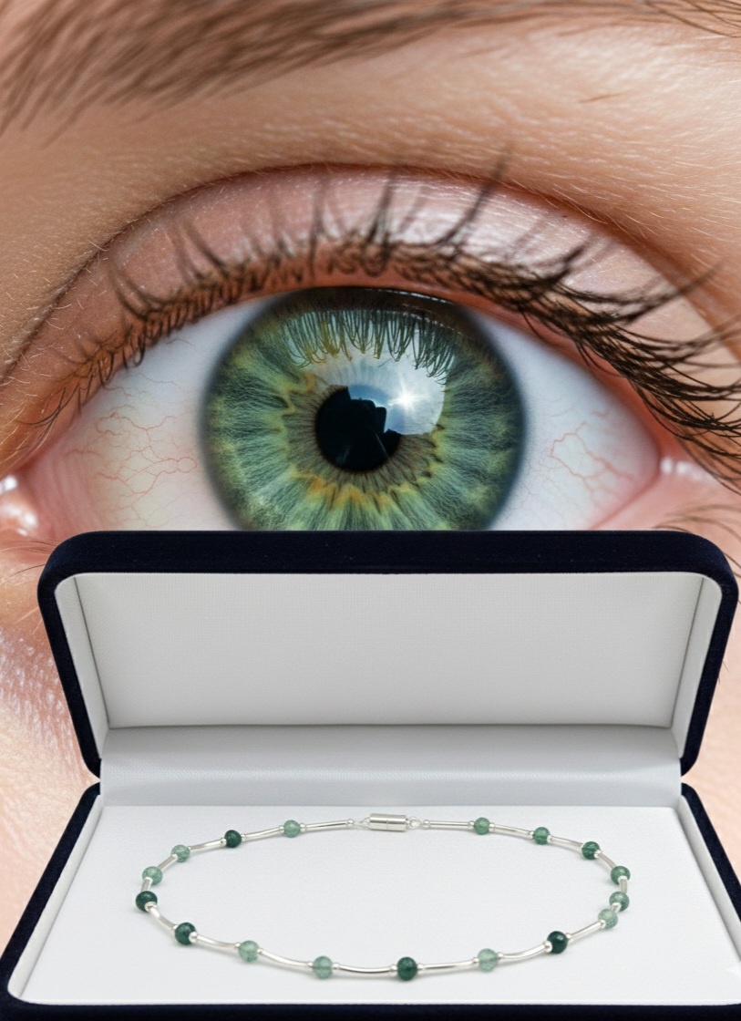 Naszyjnik ,,Szmaragd Oczu" z agatów w połączeniu ze srebrem najwyższej klasy jest nowym pomysłem stworzonych przez naszych rzemieślników jubilerów, pasjonatów unikatowej biżuterii. Delikatność i przezierność kuleczek agatowych urzeka refleksami załamanych promieni światła. W połączeniu z blaskiem srebrnych pókolistych przekładek tworzy oryginalny wzór. Zielony kolor agatów z delikatnymi żyłkami urzeka pięknem. Biżuterię tę można nosić do wieczorowych kreacji, jak i do casualowych outfitów.