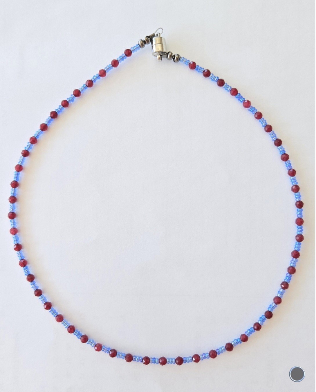 Kamienie szlachetne użyte do stworzenia naszyjnika cechują się wysoką jakością oraz trwałością. Chalcedon czerwony jest cenionym minerałem o pięknej barwie i wyjątkowym połysku. Dodatkowo, niebieskie szklane przekładki doskonale komponują się z głównym elementem biżuterii, tworząc harmonijne połączenie kolorystyczne. Zapięcie magnetyczne gwarantuje łatwe zakładanie i zdejmowanie naszyjnika bez konieczności męczenia się ze standardowymi zamkami.